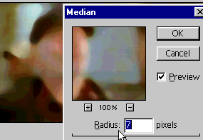 Копия в верхнем слое. Накладываем на него Median фильтр (заметьте достаточно большое значение - 7). Этот фильтр - усреднение цвета по областям, ограниченным яркостью и контрастностью. Таким образом, получается один доминирующий цвет в какой-то области. Что и нужно.