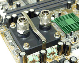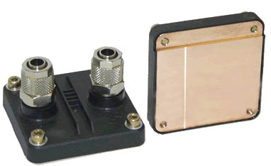 Сама основа медная, знамо дело, внутри - протоки для жидкости. Как и куда выводить шланги и что именно будет жидкость прокачивать - видимо, уже забота пользователя. Между прочим, если есть какие-то опасения, что во время работы такого радиатора нарушится герметичность, то воду можно заменить на спирт. Не думаю, что стоит делать систему проточного цикла - сильно громоздко и неудобно. Лучше, конечно, емкость и насос - и по кругу.