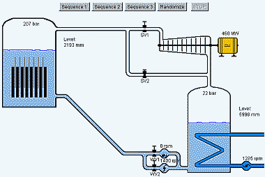 Разработчики симулятора придумали 3 аварийных ситуации (в программе их можно запустить тремя кнопками). Сам апплет позволяет управлять капанами, запуском насосов и двигать поглотители в ядерной топке. На схеме отображаются: состояние давления в различных частях системы, мощность генератора, скорости вращения роторов насосов и состояния клапанов. Все. Можно начинать выправлять аварийные ситуации. В третьей ситуации ломается охлаждающий насос, в первой - генератор, во второй - один из основных подающих насосов (во второй ситуации мне удалось достичь стабильной работы, в остальных, видимо, надо все просто глушить). Там же есть и исходники этого симулятора и описание. |
