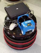 Итак, робот, показанный на фото вверху, может передвигаться со скоростью 25 см/сек. При этом, несет на себе лаптоп (с линуксом, как я понял), к нему подключен лазерный дальномер (сканер SICK LS200), который может сканировать 5 раз в секунду целый полукруг (т.е. 180 град.). Полученные точки (через каждые полградуса) записываются, а по уже ним 3D программа (на основе OpenGL) строит трехмерную картинку. Исключительно показательными являются как раз следующие две картинки (их "оригиналы" можно посмотреть на сайте):