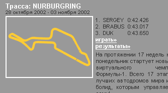 вид трассы сверху, маленькая машинка, 3 кнопки. Все. Зато результаты находятся во всеми видимой таблице, т.е. "онлайн". Так что, устанавливай рекорд - и впиши свое имя, и получи приз. Трассы - реальные прототипы автодромов, на которых проходит чемпионат "Формула-1". ссылку прислал Николай |