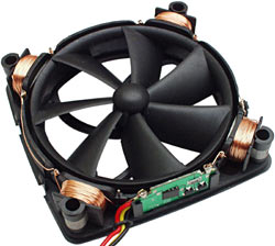 Для мелких вентиляторов щеточная организация двигателя (т.е. без магнитов или генератора) как-то не очень подходит - и так все мелкое, а тут еще щеточки... Так что, лучше бесконтактного магнитного вентилятора (то бишь, кулера) для компьютерных дел пока ничего не придумали. Конструкция проста - магнитный ротор вращается вокруг статора с катушками, которые управляются электронным контроллером. Однако, тайваньская компания Y.S.Tech (Yen Sun Technology) несколько улучшила конструкцию кулера, оставив тот же принцип, но катушки вынесла за пределы ротора, а магниты расположила по внешней окружности ротора. Вот таким образом: