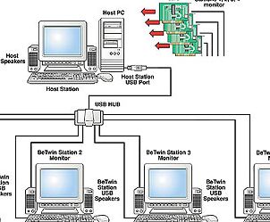 К мощной рабочей станции подключается USB-hub, к которому можно прицепить до 5 рабочих станций, принтеры и звук. Выглядит все это примерно таким образом как показано на рисунке. Мониторы подключаются к PCI картам. Так как разъем AGP всего один, придется озаботиться поиском PCI видео. Из российских ресурсов можно отметить проект "Горыныч"