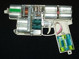 Энергия не очень большая, иначе пришлось бы увеличивать массу и габариты оружия, так как все зависит от емкости конденсаторов. |