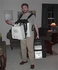 Замечательный вариант переноски _всего_ компа одним человеком. Заметьте, как обезопасен монитор... :) Мечта для PC-technitian'ов, кстати, которым приходится с компами бегать по всему зданию зачастую. |