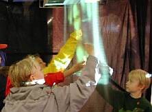 Основой для изображения является поток воздуха (нетурбулентный - а сделать его достаточно сложно), в который инжектируется поток дыма, пара (или еще чего, в оригинале написано fog - но что такое "туман" ? :)), а уже на него проектируется изображение. Примерно так. Главное, чтобы течение тумана было плоским, тогда и изображение будет неискаженным. ссылку прислал plvita |