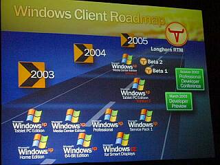 Вот такой roadmap для Misrosoft Windows. Все текущие задумки MS упираются в Windows Longhorn XP Pro. Кроме собственно Windows 2003, первенство отдается Windows XP, модификаций коей будет много - от 64-bit Edition до Media Center и Tablet Edition.