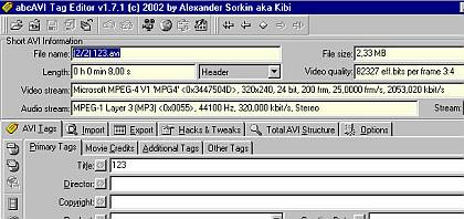 abcAVI - действительно приличная программа, которая расскажет все о файле, закодированном неизвестно кем и чем. Длину, размер, кодек (аудио тоже), даже можно поредактировать всякие поля типа названия, копирайта и т.п. Распознает более 500 кодеков (по сигнатуре FourCC и TwoCC), сигнатуры эти кстати, тоже можно поменять. (зачем только...)