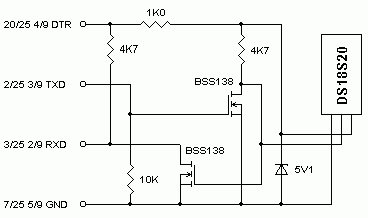 Очень простая схемка для управления цифровым термометром DS18S20. (если нет возможности достать фирменный microlan DS9097U)