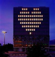 2 года назад в Берлине был проект одного компьютерного клуба, который превратил 8 верхних этажей большого здания в самый большой в мире дисплей. Из светящихся окон, конечно. Матрица получилась конечно совсем неплотной - 18х8, но для всяких символов и этого хватило. Там даже с помощью мобильника можно было в Pong поиграть.