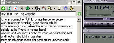 Заценил прогу EvilLyrics. Сделана на основе IE-движка (явно использует вызовы), поэтому занимает всего около 300к. Может пристраиваться к Winamp и в соответствие с тэгами тут же тягать лирику с lyrics.com (и еще несколько серверов). Русские песни, разумеется, не знает. Находит почти все. Ну, кроме экзотики. У меня один раз ошиблась на группе Lacuna Coil. А так ничего - вон даже по-немецки умеет :) Все скачанные тексты складывает к себе в диру - типа кэш.