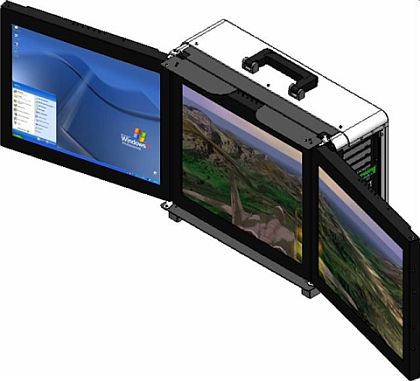 Вот такой красавец MaxPac за 17т. долларов, производящий впечатление чемодана с оттенком милитаризации. В общем-то, цена не столь уж велика на сегодня. Внутри все таки 2 Xeon'a стоят, да и три 19-дюймовых матрицы никак не для дешевых решенийы. И напичкана тачка всем чем душе угодно.