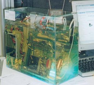 Полностью погруженный комп в масло. Вентиялтору правда тяжеловато приходится - он там ведь не воздух гоняет, хотя вообще, можно напряжение сильно снизить на нем. Обслуживать правда, тяжеловато. Потом винт и сидюк уже отдельно ставить надо. В общем, чисто академический интерес.