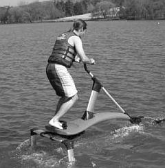 Очень интересный вид водного велосипеда. Называется Pumpabike (видимо, "pump-a-bike"). Представить как все это работает, можно из PDF-ки (на сайте) и из мувиков. А особенно - прочитав мануал. Принцип, в общем, простой - передвижение аппарата в воде обусловлено движениями человека - он должен как бы раскачивать велосипед вверх-вниз и таким образом, переднее крыло (лопатка) будет создавать импульс движения вперед. Разумеется, все это надо видеть, а лучше попробовать. Говорят, что некоторые люди с первого раза едут на нем, а у обычных людей уходит 5-6 попыток.