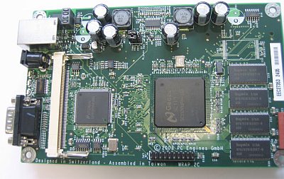 На фото - микрокомпьютер WRAP.2C (PC Engines Gmbh, Швейцария). Основа - Geode SC1100 (266МГц), 64/128Мб памяти, два miniPCI слота, слот для CF карточки (загрузка+ОС+программы), 1 Ethernet порт на плате, последовательный порт и питание. Потребляет до 5Вт. Размеры 16х10 см. Стоимось я видел здесь (120 евро).