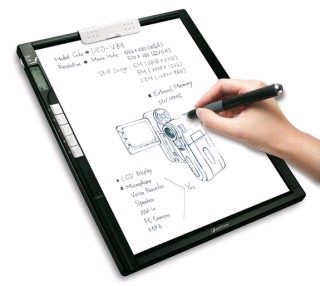 Типичный ноутпад, который запоминает рисунок. Рисовать можно прямо на экране (разрешение при вводе 1000lpi). Батареек хватает на 20 часов работы. Приблизительная стоимость - $150. Интерфейс с компьютером - USB. Габариты: 25 х 1,5 х 33 см. В нем же находится cardReader. Встроенная память 32Мб. |
