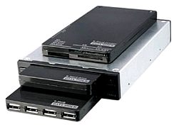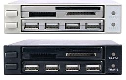Кроме 5,25" отсека есть еще и 3,5" и во многих компах он теперь простаивает просто впустую. Дисковода нет, винт обычно внизу. У меня например, 2 слота просто заглушены. Непорядок. Под маркой KAMARACK существует универсальное решение - есть два слота, которые можно заполнить либо USB-hub, либо винтом 2,5", либо card-reader'ом. Элегантный девайс, правда, его надо сильно продвигать, чтобы он появился у каджого в компьютере. Заметьте - дисководу не оставили ни одного шанса :) Что и правильно.