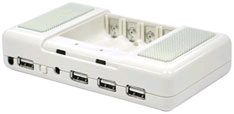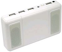 Небольшая поделка от Thanko (японцы) NB-Mate: очень простой девайс - две колонки по 1,5Вт, питающиеся от 4 АА аккумуляторов, которые могут заряжаться от USB, причем, если есть USB, то колонки питаются естественно, от USB. Ну и хаб, заодно. Вход - линейный