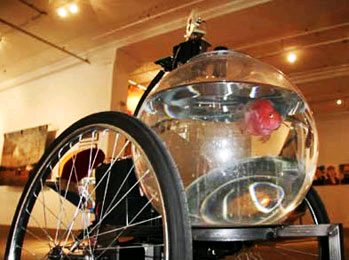 Аквариум на колесах - чего не сделаешь для любимой рыбки - "рыбка хочет гулять?" - ставим камеру, обслуживающий комп, электромеханику и рыбка (аквариум, точнее) - поехала! Комп "смотрит", куда рыбка хочет - туда и направляет коляску. Этот Fish-powered vehicle видел здесь (там же и мувик). Лучше бы какую звурешку посмышленее зарядили, а то рыбка, боюсь, шибко далека от понимания, что она вообще в аквариуме делает, а не то что куда-то "едет".