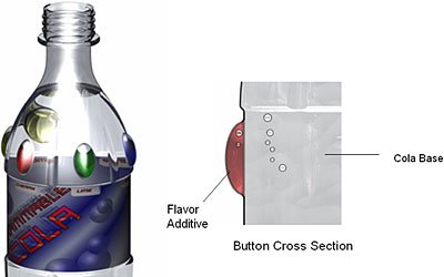 Собственно, из рисунка все понятно - водичка в бутылке самая обычная и простая газированная, а капсулы в верхней части бутылки содержат концентрат вкуса (цвета). Ну и все. Видел здесь. |