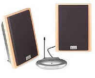 Полностью беспроводные акустические колонки: передача сигнала через BlueTooth (до 100м, как утрвеждается) и питание от батареек (каждый блок использует 6 АА), мощность 2,5Вт. Вполне приличное решение например для озвучки в каком-то временном помещении или даже на улице. Стоимость - около $100. Принимает цифровой сигнал от любого Bluetooth устройства, которое вообще знает, как передавать через BT аудио цифру.