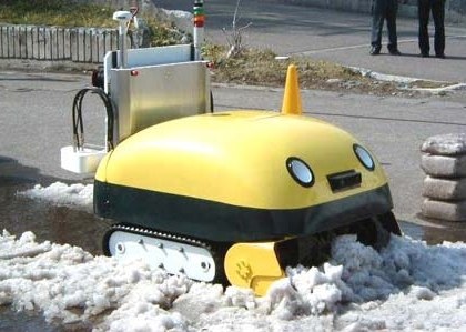Японский снегоуборочный автономный робот Yuki-taro, который упаковывает снег в аккуратные брикетики 60х30х15 см. На борту GPS и две в/камеры.