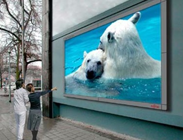 Огромный экран от Fujutsu (Super Frontech Vision LD) - диагональ 5,86м (231 дюйм). Состоит из светодиодных сборок: по три штуки. Всего около полумиллиона. Разрешение небольшое - 512х288. "Пиксел" размером 1см. Т.е. ничего сверхестественного, кроме цены - как раз по доллару за светодиод :) 520тыс. долларов. Ну и потребление соответствующее - 10кВт. Вот здесь оригинальная страница с подробными характеристиками.