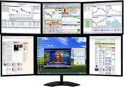 CineMassive MasterPlex 21T - один дисплей в ценрте внизу - 21,3 дюйма и 5 штук 17-дюймовых, два из которых находятся в ориентации portrait. А вот указанная цена в $3.200 мне кажется несколько завышенной. Между прочим, 5+1 составляет более 8.5млн. пикселов в сумме (21,3" - 1600х1200 и 17" - 1280х1024). Я вот гадаю - как все это богатство подключать к одному компу?