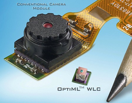 OptiML Wafer Level Camera от компании Tessera Technologies. На фото - слева вверху - обычный модуль типичной миниатюрной в/камеры, внизу - микрокамера OptiML, которая может быть создана на одной кремниевой пластине в одном технологическом процессе. Вместе с оптикой. Все это резко уменьшает цену на аппараты, использующие микро-камеры: PDA, сотики и пр.