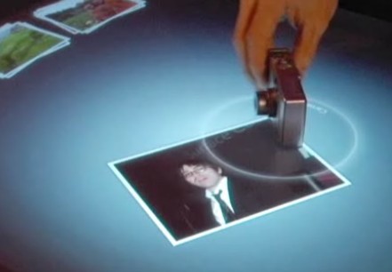 Снимаем на фотик, ставим фотик на поверхность "стола", он (фотик) распознается (круг на поверхности), наверняка - это еще и меню, конечно, фотка сливается (через BT скорее всего), потом появляется на столе. И ей можно манипулировать.