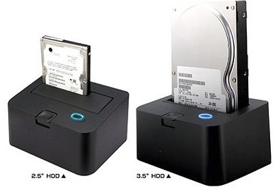 Вот такая вот крэдла для 2,5 и 3,5-дюймовых винтов. Причем, как видно на фотографии, винты можно устанавливать обоих типов - очевидно, имеется два разъема. Стоимость - от 50 долларов, имеется кнопка Eject. Винчестеры - только SATA, что и понятно. Исключительно удобная коробочка для тех, кто часто работает с винтами. Интерфейс USB. При этом, я уверен, что для 3,5-дюймовых винтов все же, необходимо стороннее питание.