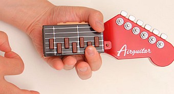 Да, это именно такая вот гитара, которая с помощью ИК датчиков смотрит, как играющий "щиплет" струны. Таким образом, гитара становится совершенно карманной. Модель - Air Guitar . Клавиши на грифе - видимо замена поджиманиям струн. Тем более - их нет. $27 стоит гитара, не стратокастер конечно, но игрушка интересная, тем более, что внутри есть динамик (линейный выход - тоже). Видел здесь.
