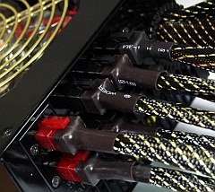 Enermax Galaxy - 1000W. Красавец. Разработчики, кстати, хвастаются особым КПД (до 85%) этого блока питания. Примерные внутренности можно посмотреть здесь. Одновременно можно питать 4 самых современных процессора, две дюжины винтов, кучу периферии и т.п. На блоке питания идут уже отдельные разъемы для платы, отдельные для винтов, оптических приводов и периферии (фото справа). Вот те два красных разъема - над ними написано "PCI-S only".