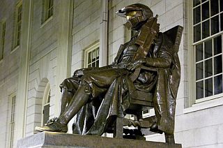 Статую Гарварда немного переделали под Master Chief (из игры Halo 3). А я как-то давно уже публиковал одно из тамошних студенческих развлекух, когда они на крышу здания затащили макет полицейской машины, оборудовали мигалками, поставили рядом макет полицейского. В общем, тоже неплохо получилось. |