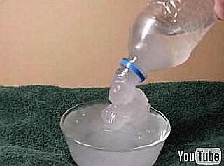 Хотя глядя на "опыт", который называется Supercooling, вполне можно назвать его "самым". Или одним из. Вообще, такой резкий переход фазового состояния в обычных условиях подталкивает меня к мысли, что это не вода. И процесс наверное не является "замораживанием". Может что-то из полимеризации... Очень интересный опыт. Думаю, в комментариях раскроют секрет :) А может там какой-то состав, который подталкивает основную жидкость к смене фазы и все это является эндотермической реакцией, что и позволяет далее "замораживать"... ссылку прислал Saniok |