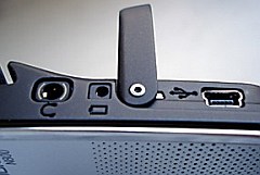 Входы-выходы-карточки: гарнитура, питание (зарядка), USB miniB разъем. При подключении к компу показывается как две SD-карточки. Одна из них стоит там внутри под крышкой, вторая - пользовательская microSD - внешний разъем.