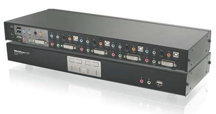 Продвинутый KVM от iogear: 7.1 звук и DVI интерфейс, который запонимает параметры видео от каждого компа и при загрузке компов выставляет их как положено. Разумеется, эмуляция мыши и клавиатуры для загрузки без ошибок. Замечу, что PS/2 портов нет - есть только USB. В виде хаба.