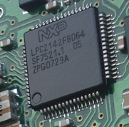 С нижней стороны платы: чип сотового телефона, микроконтроллер LPC2142FBD64 (ARM7, 64K FLASH), куда записываются данные GPS и данные от датчиков. И совершенно отдельная батарейка. Скорее всего - для микроконтроллера, как самое резервное питание.