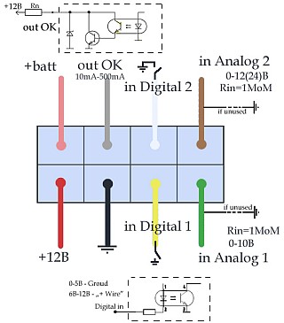 Схема слева (увеличенная под ней) показывает разводку разъема вместе с датчиками и выходом. Подробнее - см. PDF в конце статьи. Сам АвтоГРАФ выполнен в виде полуфабриката - его необходимо где-то установить в автомобиль, подключить две антенны, расположить (умно) сами антенны, подключить питание от аккумулятора, где-то расположить дополнительный аккумулятор (12В, 1Ач), при необходимости - подключить входы-выходы и самое главное - установить SIM-карту внурть и немного попрограммировать девайс на компе через USB.