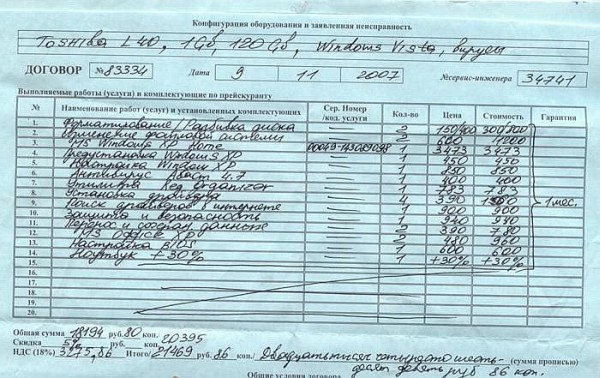 Была уже такая тема, помнится мне, просто вот на глаза попалась еще раз (оригинал) вместе со статьей. То что прайс написан в жанре фантастики - это понятно, то что снеся висту и поставив XP пришлось ставить всего 4 драйвера - тоже из разряда трюков. То что поставлен пиратский офис - тоже понять можно (хотя винда вроде номерная), но меня больше интересует та ситуация, когда действительно, надо серьезное что-то сделать, а не просто тупо переставить винду. Иногда бывает, надо много чего перелопатить в интернете и иметь серьезный багаж знаний, чтобы решить какую-то неординарную проблему. Причем, "снаружи" выглядящую очень просто, но в реальности тебующие дня два-три работы. Не вспомню сразу такую задачу, но они встречаются - поверьте. В этом случае (даже если они ее решают таки) - какие они цифры напишут в счете? :)