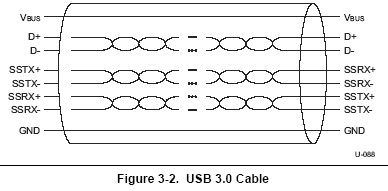 Каждая пара будет защищена оплеткой (shielded). Вообще, кабель достаточно сложный в разрезе и в наполнении - там есть даже стоковые GND провода в высокоскоростных парах (которые соединены с GND хоста, но не соединены с разъемом). Т.е. проводов в кабеле больше, чем 4 пары - всего 10. Ну и знак SS USB: