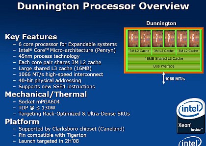 Недавно Intel анонсировал последний в линейке Penryn процессор о шести ядрах - кодовое имя Dunnington. Построен будет также на 45нм технологии. Вот здесь есть небольшой PDF.