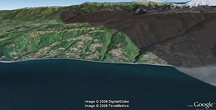 Красиво получается - Google Earth плагин, который позволяет работать с картой (спутниковой, конечно). Как именно он правильно "поднимает" поверхность - не очень понимаю, все же, могут быть артефакты. Либо используется готовая карта высот. На это указывает и облачность - видно, что текстурка "натянулась" на воду, хотя можно было бы сделать облако (но трудно, видимо).