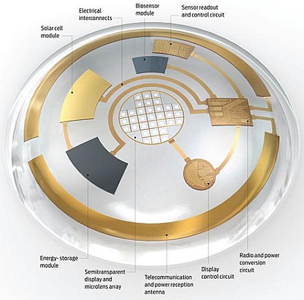 Интересный концепт контактной линзы, которая скорее всего, если и будет, то будет первым реально "встраиваемым" кибер-устройством. В общем, с питанием особых проблем нет - радио плюс солнечная энергия, контроллер, биосенсор, полупрозрачная матрица с микролинзами. Первое предназначение - мониторинг уровня сахара в крови. Второе и основное для всех - "дополненная реальность". Т.е. augment reality. Заметьте, кстати, как гигантский потенциал практичности augment reality выдвинул на первое место именно ее, а не виртуальную реальность (!). Хотя настоящая реализация augment , я бы заметил, наверное посложнее будет, чем virtual. Здесь, например, напрашивается ночное зрение - сенсоры ведь без проблем могу и в ИК диапазон залазить.