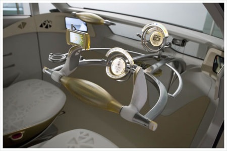 Футуристичная модель Toyota FT-EV II (концепт) с альтернативным элементом управления - даже немного steam punk что-то проглядывает. Как это модно сейчас - машина гибридная, на Li-Ion. Педалей тоже, кстати, нет. Видимо, разгон-торможение осуществляется продвижением "штурвала" взад и вперед.